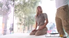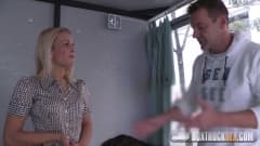 Cecilia Scott é essa bela loira que esse homem não vai desperdiçar. Eles estão dentro de um camião de vidro fumado onde ninguém pode vê-los.