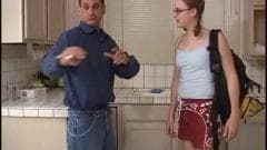 Este cara descobre que a irmã de seu amigo está em casa masturbando-se com seus dildos e finge ajudá-la com o sexo real do bom.