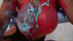 Esta morena adora foder depois da aula e ele tem um pau enorme para dar a ela. Seus peitos são cobertos de pintura e ele adora!