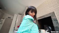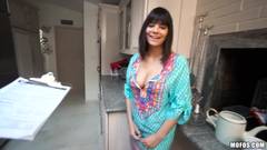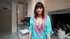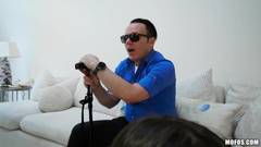 Essa bela morena vai enganar seu marido que parece cego, e ela faz isso sugando um bom pau na sala de estar da casa e na cozinha.