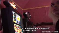 Esse cara procurou por uma boa prostituta no casino. Ela é loira e não tem problema em ir ao banheiro com ele para curtir muito.