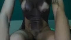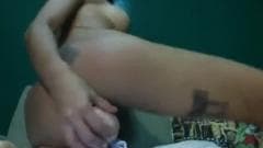 Esta mulher comprou um vibrador com forma de um pau, mas é muito largo e com o qual ela tenta ficar muito animada quando está na frente da webcam.