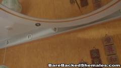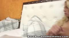 Esta trans loira gosta de ter prazer e vai deliciar-se com o seu amigo de pau grande ao levar com a sua verga bem fundo, enquanto se masturba e goza !