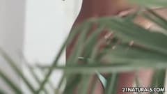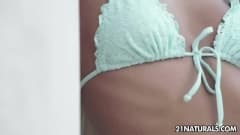 Esta garota linda está cheia de tesão e vai se masturbar fora de casa para se aliviar! Ela tira o biquini, mete os dedos na buceta e acaricia o clitóris!