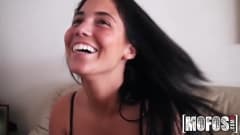 Uma jovem morena gostosinha vai empolgar bem o cara se despindo sensualmente e se esfregando no colo dele antes de começar o boquete e a trepada cavalgada!