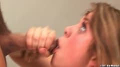 Jessie Andrews, uma jovem loira sexy, é fodida no sofá, onde ela é fodida com força e se ejacula por todo o seu rosto bonito