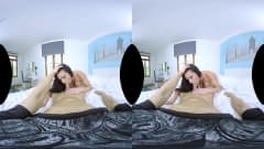 Puta morena jovem e bonita com meias brancas chupa a piça de seu amante e o monta em VR. Veja como ela o monta profundamente, uma cena sexy!