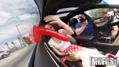 Alexis Rodriguez brinca com um pau de plástico no carro, toca os peitos e enfia o dildo na boceta e depois chupa o pau grande do cara e é bem fodida!