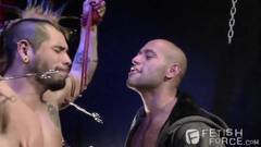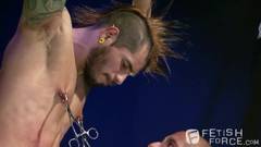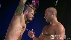 Com correntes, este homem amarra seu amigo para castigá-lo enquanto ele está nu, aproveitando a maioria de suas táticas para excitá-lo.