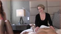 A Mistress T se masturba um cara na POV enquanto a morena observa