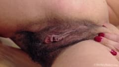 Essa linda mulher de calcinha azul está posando em algumas posições muito sensuais, ela tem uma buceta muito peluda e muito natural.