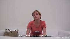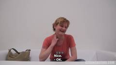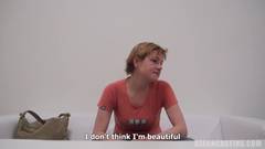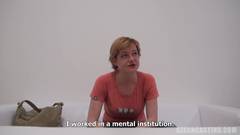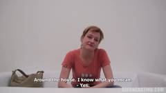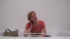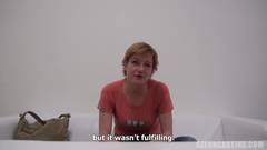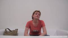 É uma moça que está falando e então ela começa a tirar a roupa enquanto um cara se masturba e transa com ela