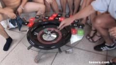 Alguns jovens jogando roleta e quando calha em alguém você tem que fazer o que é pedido. É um jogo interessante