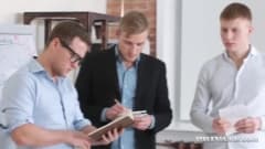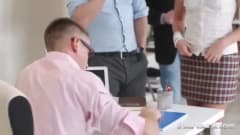 A estagiária sexy interrompe uma reunião e vai ter que cuidar de 4 homens com tesão. Ela é bem butinha e adora pagar boquetes durante a dupla penetração!