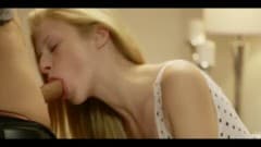 Eine junge Blondine lässt sich gerne vom Schwanz ihres Freundes befriedigen solange er auf ihren Bauch wichst.