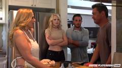 Duas loiras bonitas, grandes, maduras e jovens têm sexo lésbico e compartilham um grande pinto depois do jantar de natal.