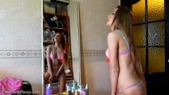 Uma jovem muito bonita experimenta roupa interior sexy na frente do espelho. Não perca sua bela bunda no fio dental.