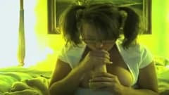 Jovem roliça mostra seus seios grandes naturais e fica mamando num cacete de borracha enquanto massaja sua buceta gordinha na net.