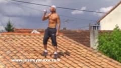 Enquanto este cara fixa as telhas do telhado, fica muito quente com o sol e isso faz com que ele se sinta um enorme prazer e desejo de se masturbar.