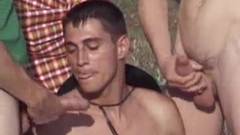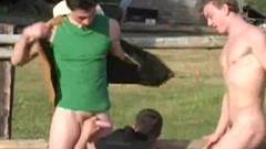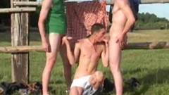 Aqui vamos ver George Plozen, Sebastian DeLong, Milan Breeze e Tommy Sem fodendo na frente do estábulo depois de um dia de trabalho no campo.