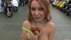 MILF Mamalhuda de gangue na loja de bicicletas por um bando de homens com pilas grandes esta puta chupou todas as suas pilas e bebeu o esperma
