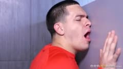 A bela Diamond Foxxx entra no banheiro e faz um bom boquete e um canudo pelo gloryhole com sua boca rica