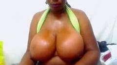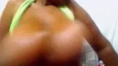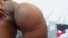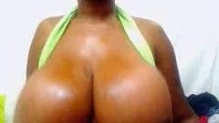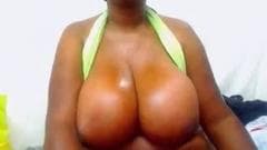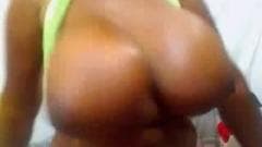 Negra com um par de seios enormes e naturais exibe-os bem perto da camera para deixar você cheio de desejo e a bunda dela também é muito gostosa