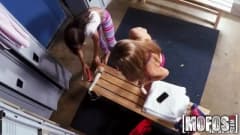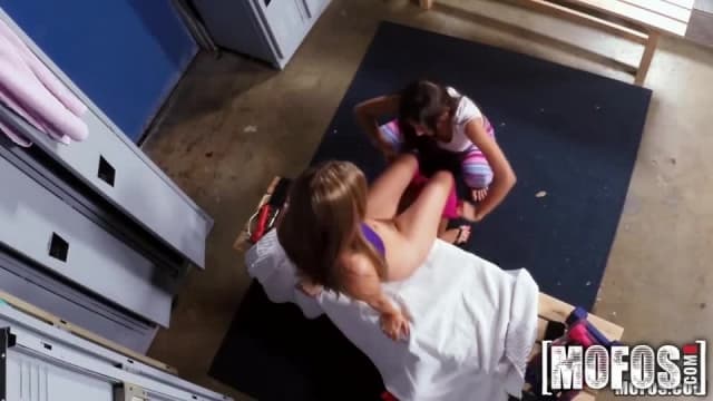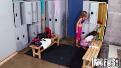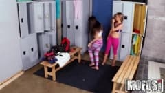 Duas garotas gostosas se divertem com brinquedos e chupando uma à outra no vestiário, quando são surpreendidas por um homem que vai foder as duas!