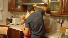 Um jovem casal salta a sobremesa e fode logo após o jantar sem subir as escadas. Eles fodem em cima da mesa.