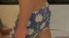 Um jovem casal está tomando banho juntos e há um pouco de fricção porque ela sopra seu pau e depois é levada por trás.