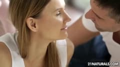 Uma linda e jovem mulher lê um livro deitada no tapete quando um gostoso faz uma proposta indecente em seu ouvido, Eles se beijam e dão uma trepada intensa