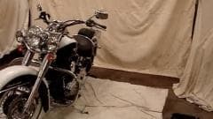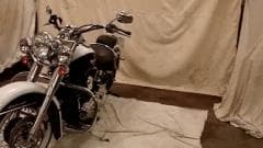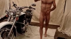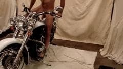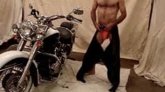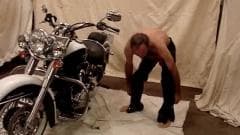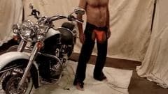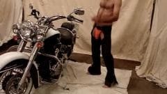 Este homem faz um striptease na frente de sua moto. Ele está tirando tudo pouco a pouco e está se movendo sedutoramente como nós gostamos.