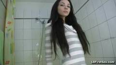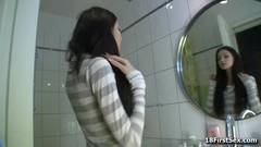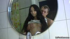 Um jovem casalinho tesudo dá uma transada gostosa em vários lugares no banheiro...