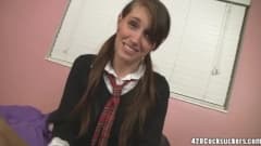 Essa jovem estudante se diverte muito enquanto se masturba com seu uniforme vestido antes de chupar o galo do namorado com força e foder com ele