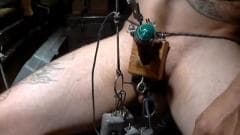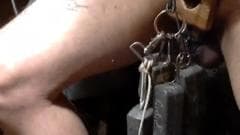 Esta maneira de bater punheta é um pouco estranha. Com vários objetos, fios e pesos, esse cara nu nos mostra como amarrar seu pênis.