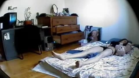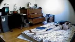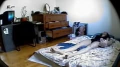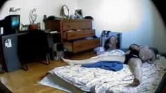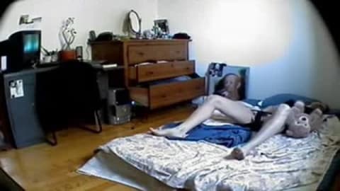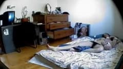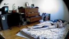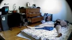 Essa morena não percebeu que no buraco da parede há uma pequena câmera gravando o momento em que ela está de topless na cama.