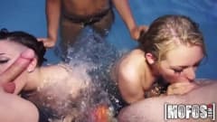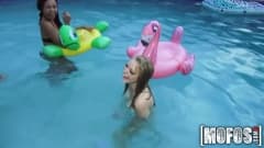 Um banho de piscina entre amigos vai ficar mais quente e se transforma numa orgia bem safada, em que as 3 garotas se beijam e fodem com 2 caras!